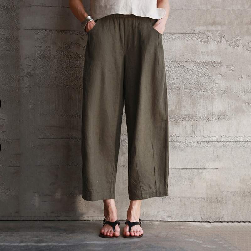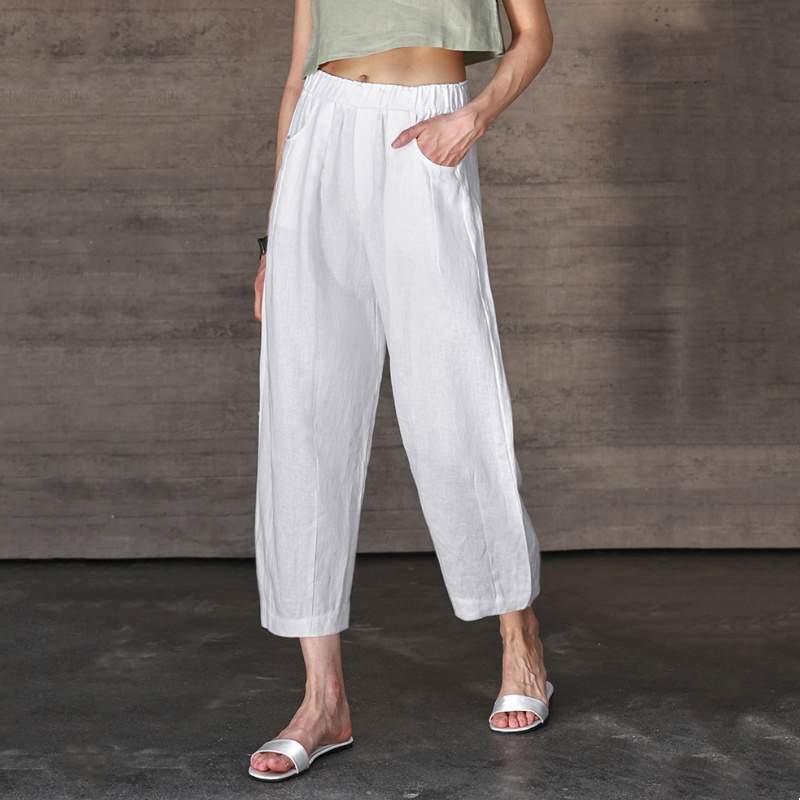 100% Linen Straight Leg Pants for Women – Elastic Waist Loose Fit Casual Trousers
