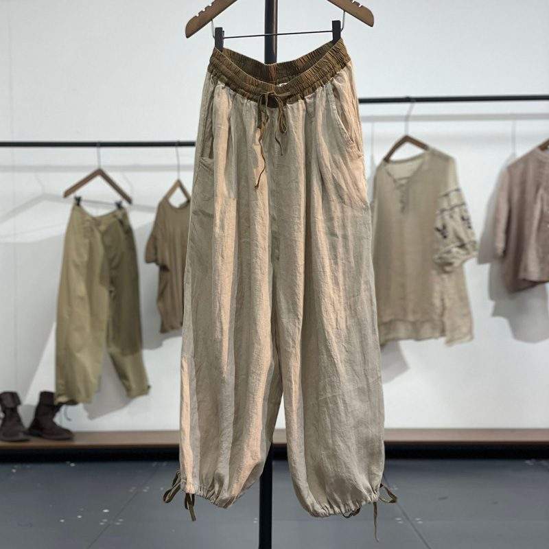 Here are some of the features of the Clashing color elastic waist loose drawstring linen harem pants: