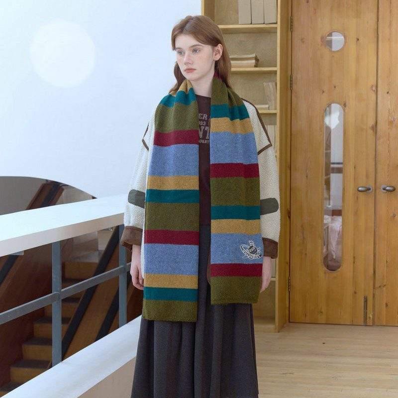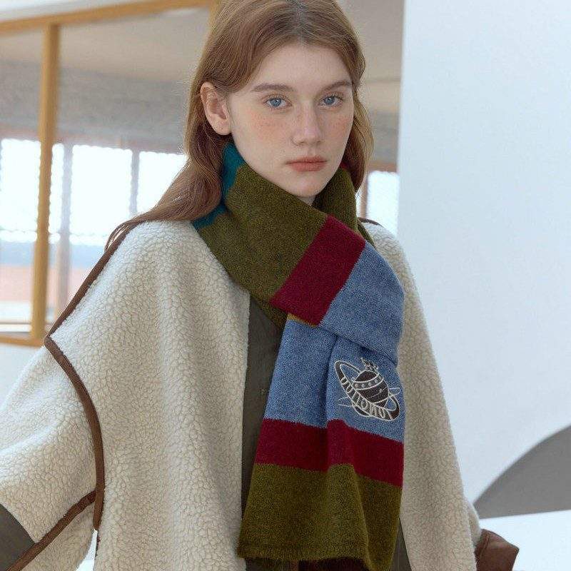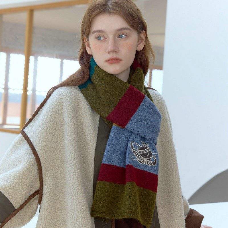 Color-block striped embroidered knit scarf, soft and cozy. Perfect for winter daily wear, commuting, and casual outfits.
