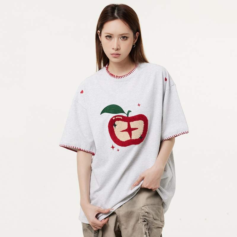 Terry Embroidered Short Sleeve T-Shirt – Loose Fit Casual Women’s Top