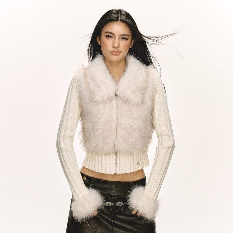 Women’s Knitted Patchwork Faux Fur Jacket – Warm Autumn Winter Outerwear